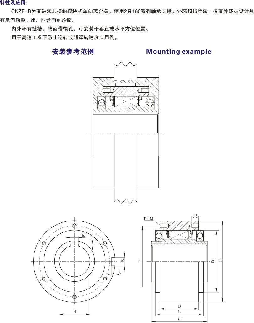 CKZF-B為有軸承非接觸式單向離合器。使用2只160系列軸承支撐。外環(huán)超越旋轉(zhuǎn),僅有外環(huán)被設(shè)計(jì)具有單向功能。出廠時(shí)含有潤(rùn)滑脂。