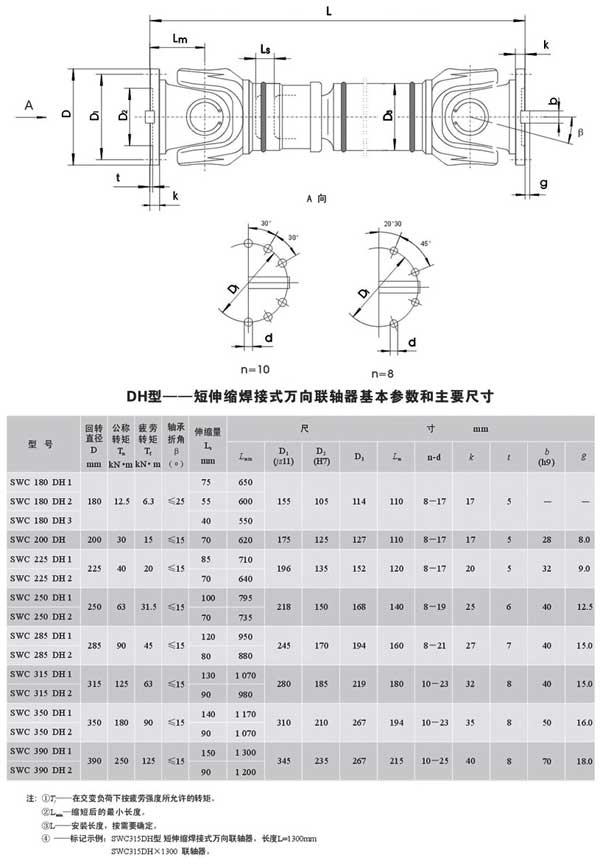 SWC-DH型短伸縮焊接式萬(wàn)向聯(lián)軸器的共同特點(diǎn)是角向補(bǔ)償量較大,不同結(jié)構(gòu)型式萬(wàn)向聯(lián)軸器兩軸線夾角不相同,一般≤5°-45°之間。萬(wàn)向聯(lián)軸器利用其機(jī)構(gòu)的特點(diǎn),使兩軸不在同一軸線,存